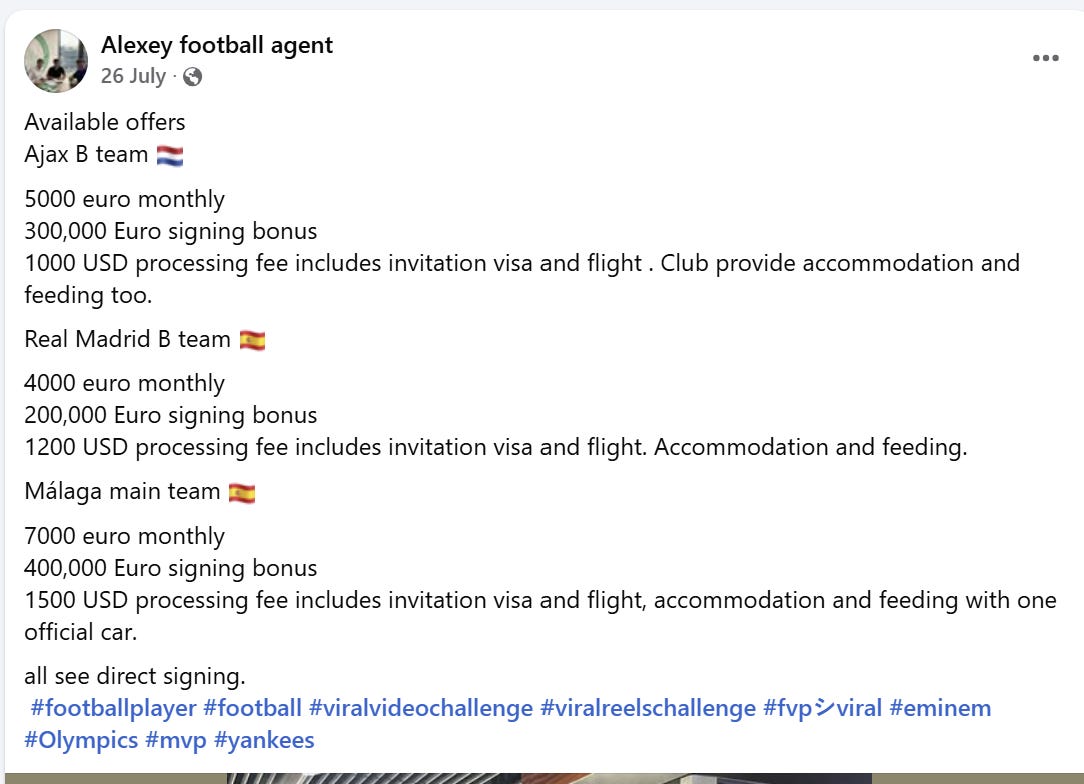 None of it was real. Needless to say, no legitimate club scouts unknown foreign players through generic Instagram posts requiring upfront payments. But the illusion works for some.