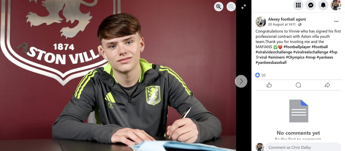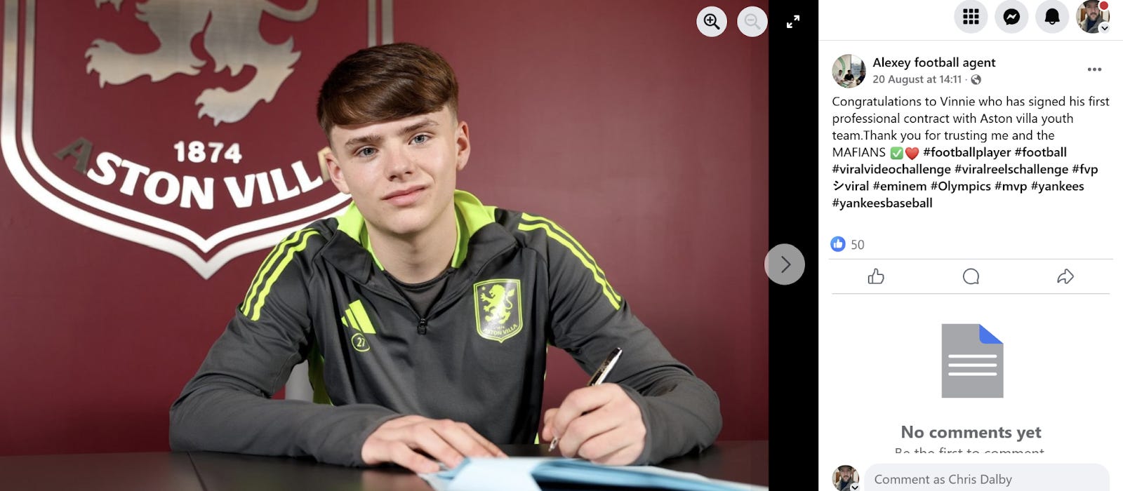 On August 20, 2025, he posted a photo of Vinnie Hayward, a rising talent at Aston Villa, pen in hand, signing a contract. “Thank you for trusting me,” the caption read, as if Mirontsev had brokered the deal. In truth, Hayward had been in Villa’s academy for years and signed professionally six months earlier, in February, a fact easily verified via the club’s own website, from which the image was taken.