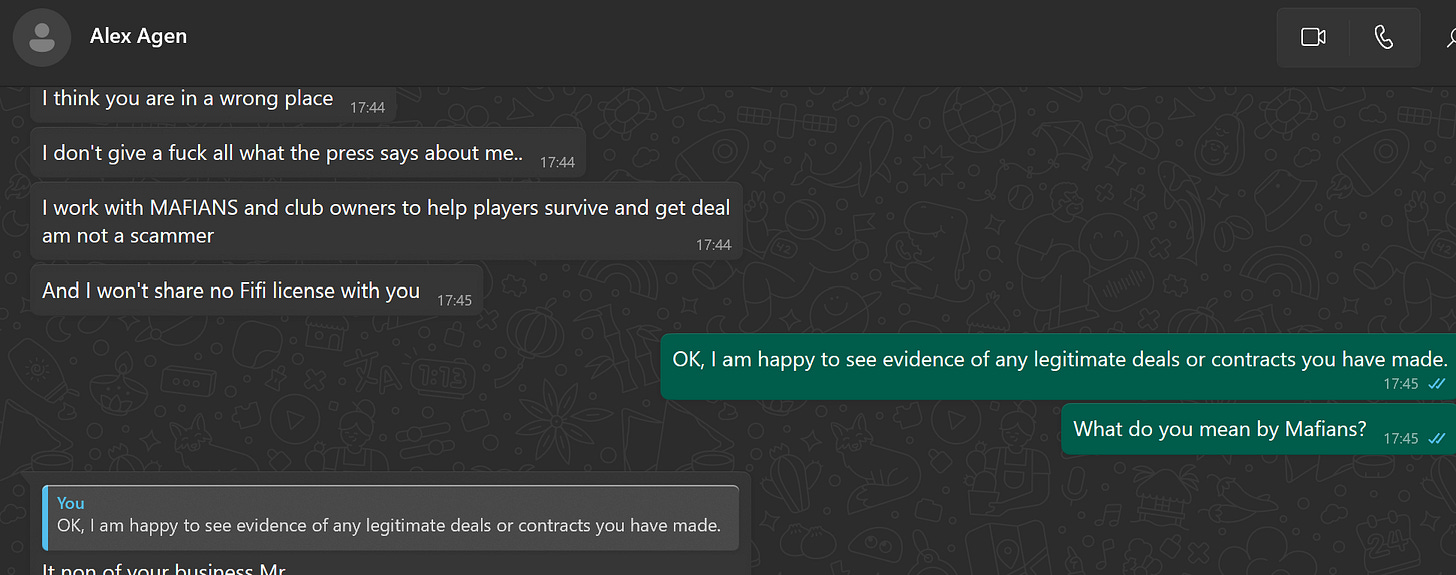 When pressed about the payments he solicits, Mirontsev did not deny asking for money – instead, he argued that his fees were fair. “Do you have evidence that they paid and I didn’t do the job?” he retorted. When told that football clubs Mirontsev claimed to work with had ever heard of him, his reply was that “Lol, the club might not know me in person – doesn’t mean I don’t have my ways. That’s why it means working with the MAFIANS.” In essence, he suggested that he could bypass official club knowledge by greasing palms or using criminal networks.