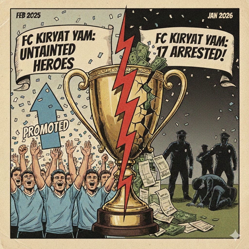 A year ago, Israel's third-tier division was suspended for astonishing levels of match-fixing. Now, a club, FC Kiryat Yam, that was seen as a model team just had 17 players and coaches arrested.